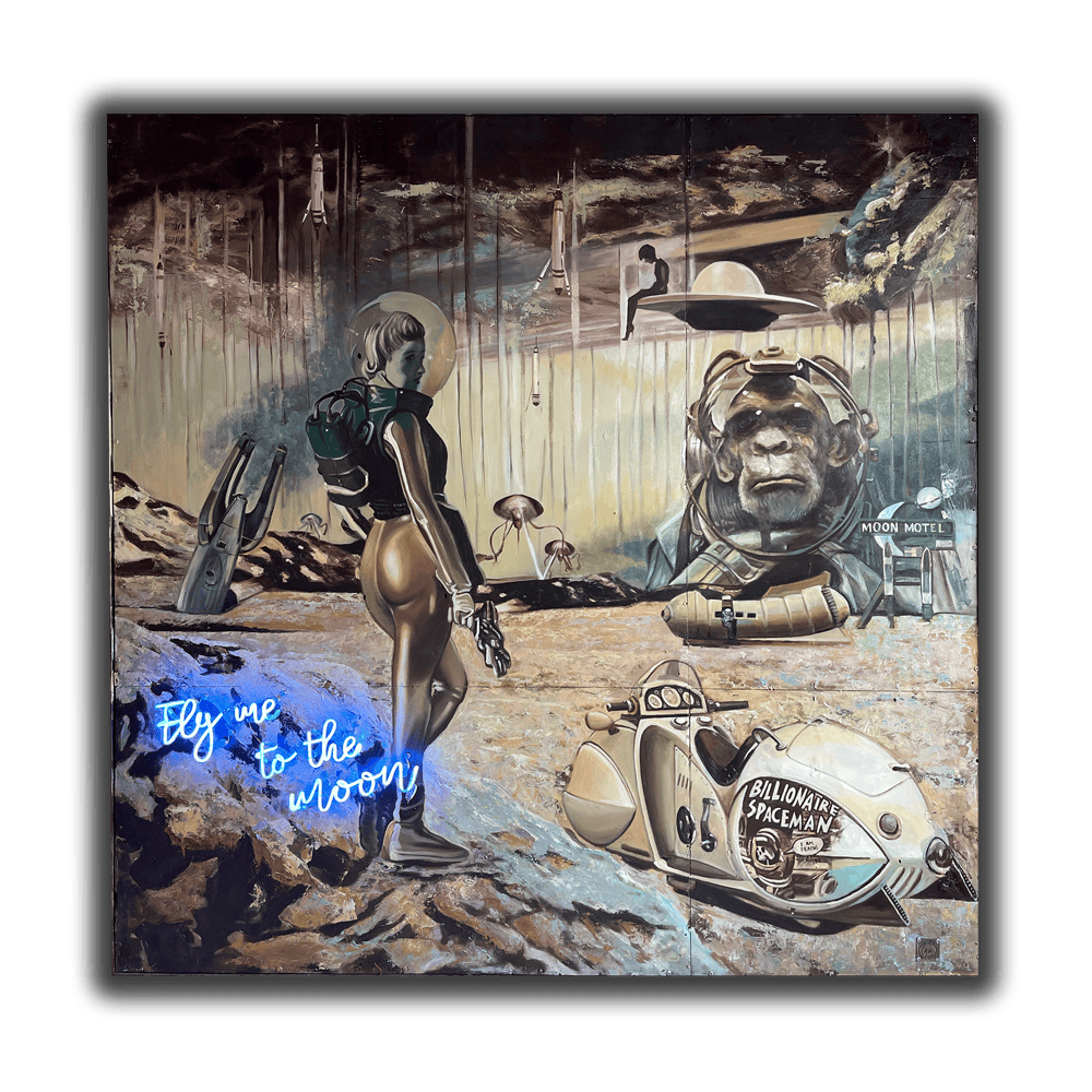 FRENCH COMPOSITE POP ARTIST JEROME PESCHARD PLAYS A SIGNIFICANT ROLE IN THE ASIAN CONTEMPORARY ART SCENE, MERGING THE PAST WITH THE PRESENT, TO INVOKE IMPACTFUL AND SUBVERSIVE VISUAL NARRATIVES. CURRENTLY RESIDING IN HO CHI MINH CITY, PESCHARD DRAWS INSPIRATION FROM DADAISM, THE VIBRANT CULTURAL TAPESTRY OF VIETNAM, RENOWNED CULTURAL AND HISTORICAL ICONS, AND VARIOUS CITIES ACROSS THE GLOBE. HIS SIGNATURE TECHNIQUE IS MARKED BY THE USE OF OIL ON RUSTY CORRUGATED IRON SHEETS, SOURCED FROM LOCAL CONSTRUCTION SITES WITHIN THE REGION, TO REFLECT SAIGON’S RAPID TRANSFORMATION AND THE EPHEMERAL NATURE OF ITS COLONIAL PAST. COINED THE ‘’GAUGIN OF VIETNAM,’’ PESCHARD’S WORK BLENDS POP ART COLLAGE WITH ASIAN AESTHETICS, INSPIRED BY THE LIVELY STREET SCENES OF HISTORICAL FRENCH INDONESIA AND VINTAGE USA. HIS SIGNATURE PIECES COMBINE PICTORIALS OF ANTIQUE AUTOMOBILES, LADIES BEARING VIETNAMESE AO DIA, AND FRENCH COLONIAL ARCHITECTURE, SHOWCASING HIS PROFOUND RESPECT FOR HISTORY AND CULTURE. HIS ARTISTIC PROCESS COMBINES PRECISION AND INNOVATION, BY FIRST DEVELOPING HIS COMPOSITIONS DIGITALLY IN PHOTOSHOP BEFORE PAINTING THEM ONTO METAL. THIS TECHNIQUE ENSURES A METICULOUS INTEGRATION OF MULTI-LAYERED DETAILS, WITH HIS FINAL PIECES OFTEN CAPPED BY A NEON SIGN TO REFLECT THE PAINTINGS’ CENTRAL THEMES. JEROME PESCHARD’S ART REFLECTS A LIFE FULL OF CREATIVITY AND RICH EXPERIENCES, HIS WORKS A FUSION OF EAST AND WEST. DRAWING FROM THE DYNAMIC SPIRIT OF HIS ADOPTED HOME OF VIETNAM WITH HIS FAMILY AND 7 KIDS, HE’S COMMITTED TO STORYTELLING, AND CEMENTING HIS DISTINCT ARTISTIC IDENTITY.