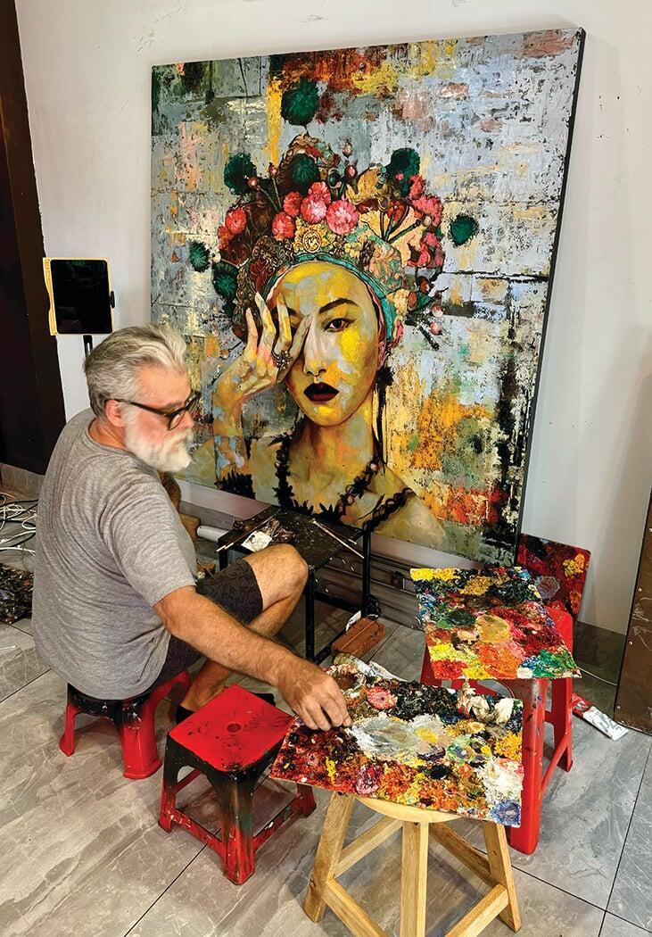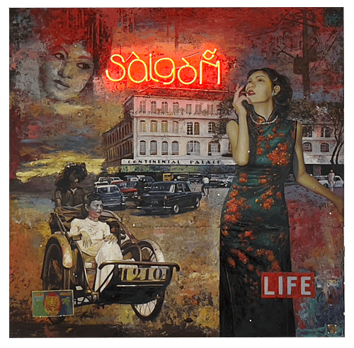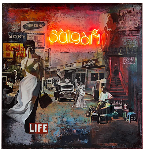 FRENCH COMPOSITE POP ARTIST JEROME PESCHARD PLAYS A SIGNIFICANT ROLE IN THE ASIAN CONTEMPORARY ART SCENE, MERGING THE PAST WITH THE PRESENT, TO INVOKE IMPACTFUL AND SUBVERSIVE VISUAL NARRATIVES. CURRENTLY RESIDING IN HO CHI MINH CITY, PESCHARD DRAWS INSPIRATION FROM DADAISM, THE VIBRANT CULTURAL TAPESTRY OF VIETNAM, RENOWNED CULTURAL AND HISTORICAL ICONS, AND VARIOUS CITIES ACROSS THE GLOBE. HIS SIGNATURE TECHNIQUE IS MARKED BY THE USE OF OIL ON RUSTY CORRUGATED IRON SHEETS, SOURCED FROM LOCAL CONSTRUCTION SITES WITHIN THE REGION, TO REFLECT SAIGON’S RAPID TRANSFORMATION AND THE EPHEMERAL NATURE OF ITS COLONIAL PAST. COINED THE ‘’GAUGIN OF VIETNAM,’’ PESCHARD’S WORK BLENDS POP ART COLLAGE WITH ASIAN AESTHETICS, INSPIRED BY THE LIVELY STREET SCENES OF HISTORICAL FRENCH INDONESIA AND VINTAGE USA. HIS SIGNATURE PIECES COMBINE PICTORIALS OF ANTIQUE AUTOMOBILES, LADIES BEARING VIETNAMESE AO DIA, AND FRENCH COLONIAL ARCHITECTURE, SHOWCASING HIS PROFOUND RESPECT FOR HISTORY AND CULTURE. HIS ARTISTIC PROCESS COMBINES PRECISION AND INNOVATION, BY FIRST DEVELOPING HIS COMPOSITIONS DIGITALLY IN PHOTOSHOP BEFORE PAINTING THEM ONTO METAL. THIS TECHNIQUE ENSURES A METICULOUS INTEGRATION OF MULTI-LAYERED DETAILS, WITH HIS FINAL PIECES OFTEN CAPPED BY A NEON SIGN TO REFLECT THE PAINTINGS’ CENTRAL THEMES. JEROME PESCHARD’S ART REFLECTS A LIFE FULL OF CREATIVITY AND RICH EXPERIENCES, HIS WORKS A FUSION OF EAST AND WEST. DRAWING FROM THE DYNAMIC SPIRIT OF HIS ADOPTED HOME OF VIETNAM WITH HIS FAMILY AND 7 KIDS, HE’S COMMITTED TO STORYTELLING, AND CEMENTING HIS DISTINCT ARTISTIC IDENTITY.
